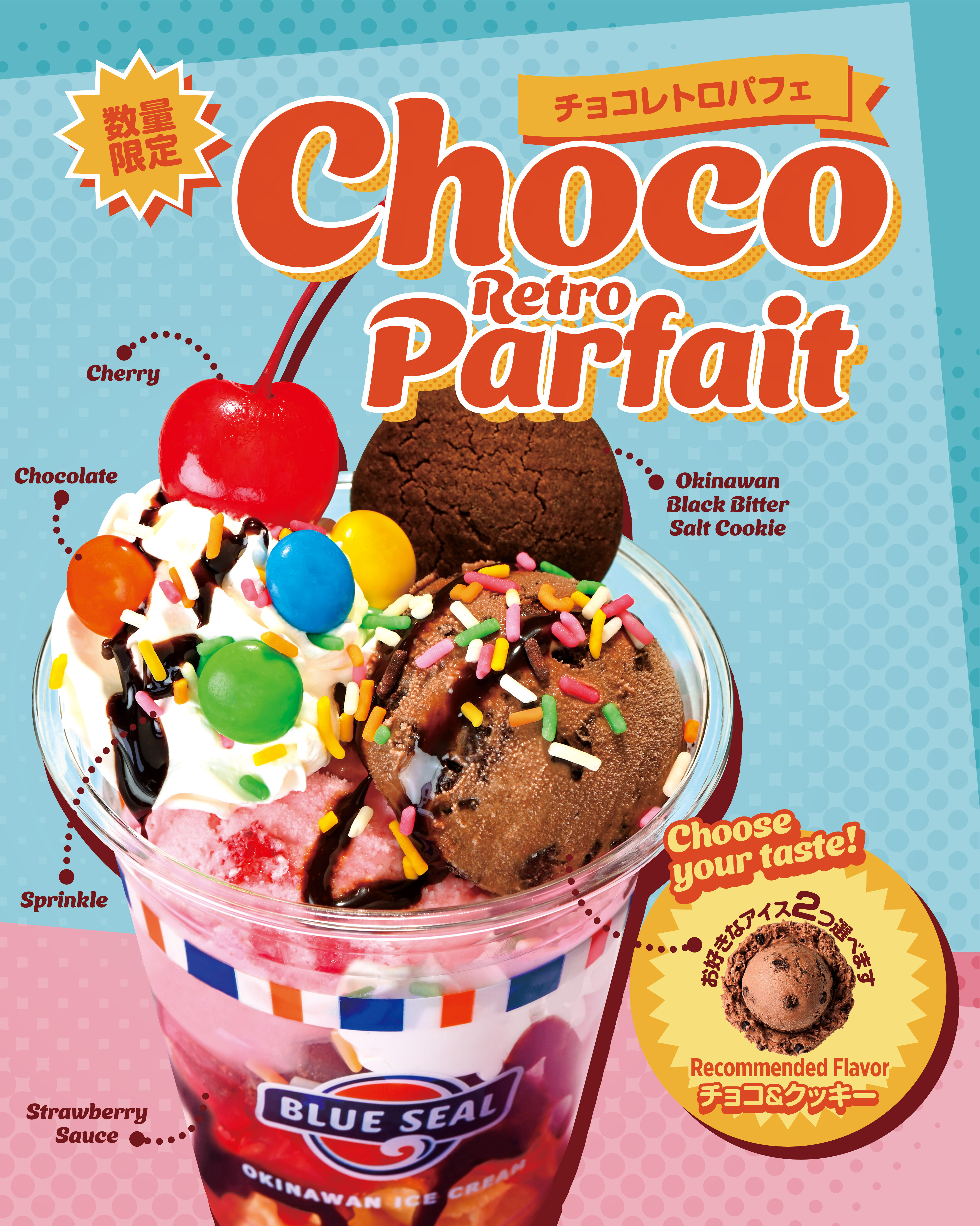 沖縄県産の塩を練り込んだビターなチョコちんすこうのサクッと食感がアクセント♪カラフルでちょっぴりレトロな見た目もどこか懐かしいチョコレトロパフェ♡
