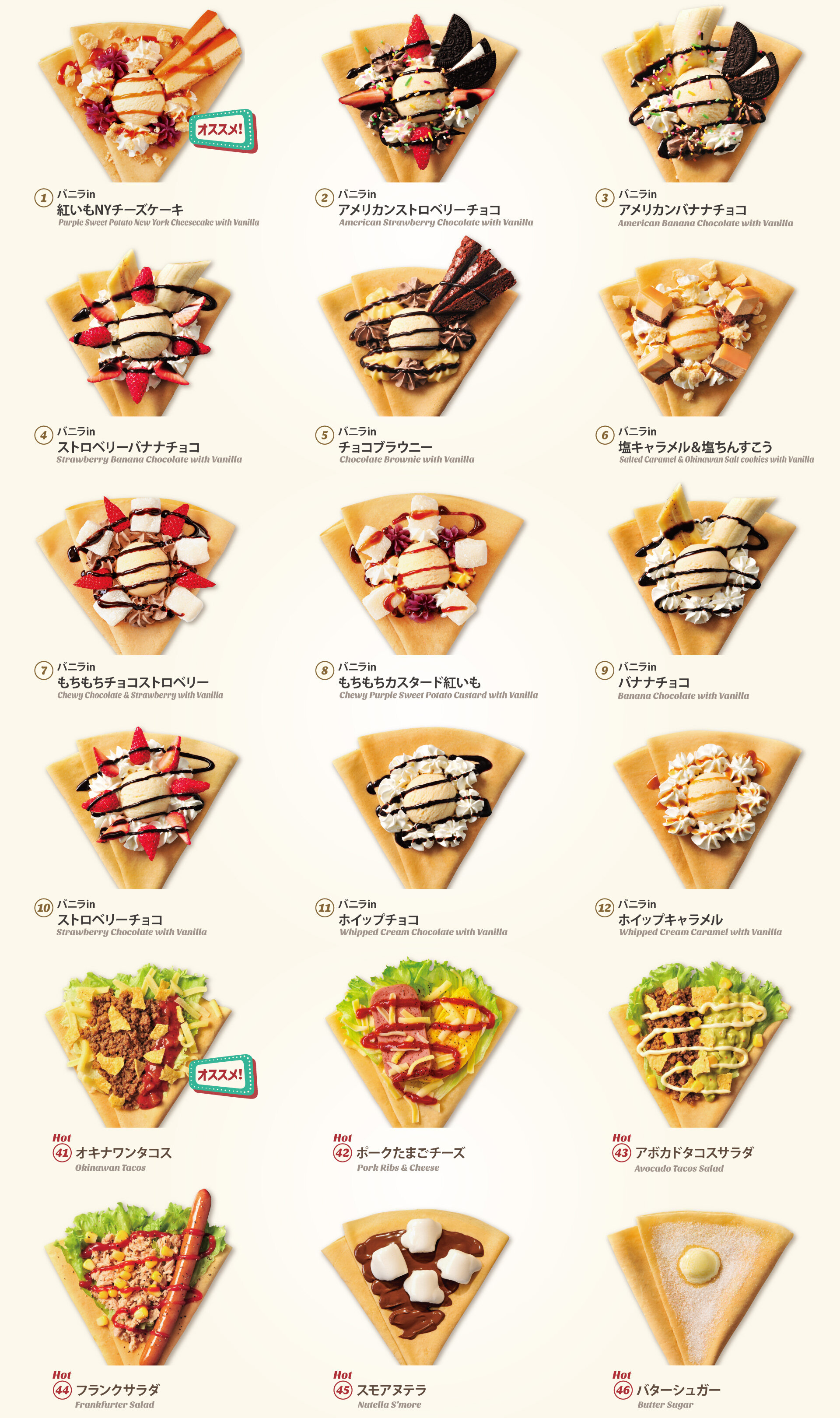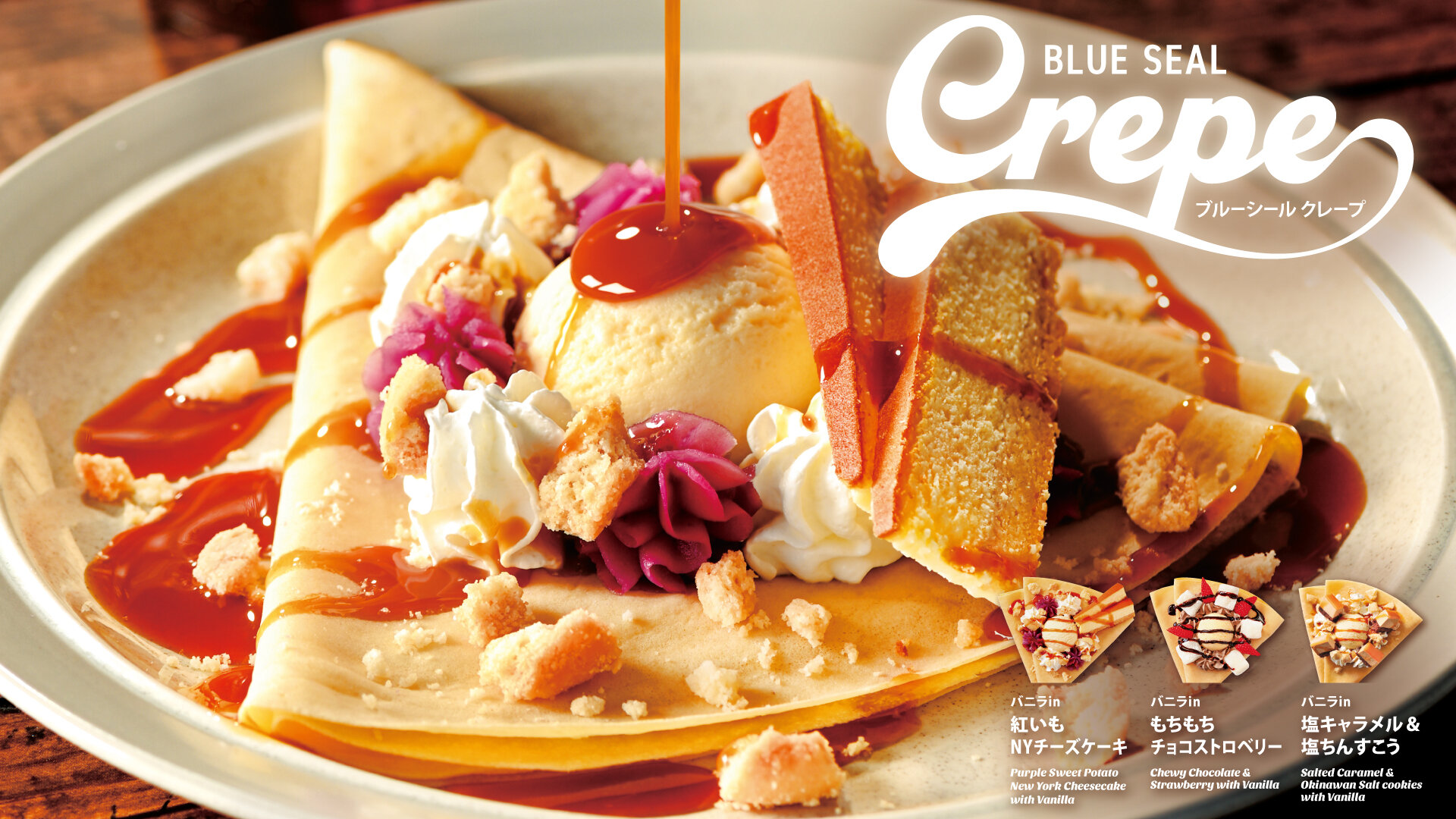 ブルーシールのクレープメニューがリニューアル焼立て、もちもち食感、バニラアイスに合うの3つのおいしさはそのままにブルーシールらしいクレープをお楽しみいただけます♩