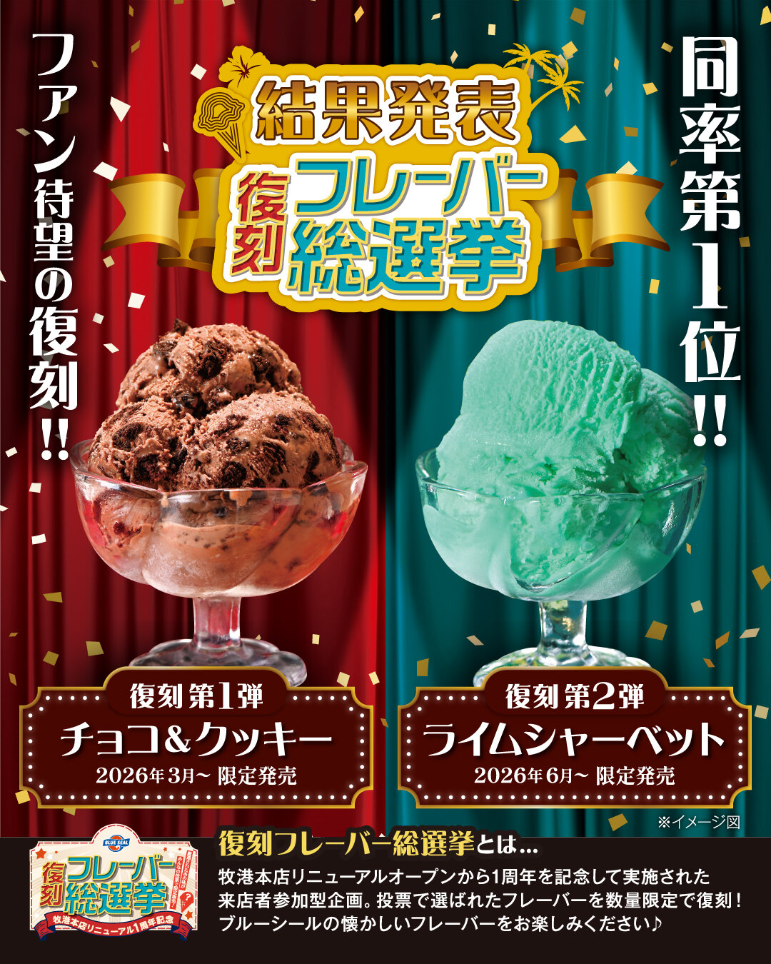 牧港本店リニューアルオープン1周年を記念して実施された来店者参加型投票企画。約2万票の中かから選ばれた同率1位のフレーバーを限定復刻シリーズとして発売いたします♪ 第1弾:チョコ&クッキー第2弾:ライムシャーベット