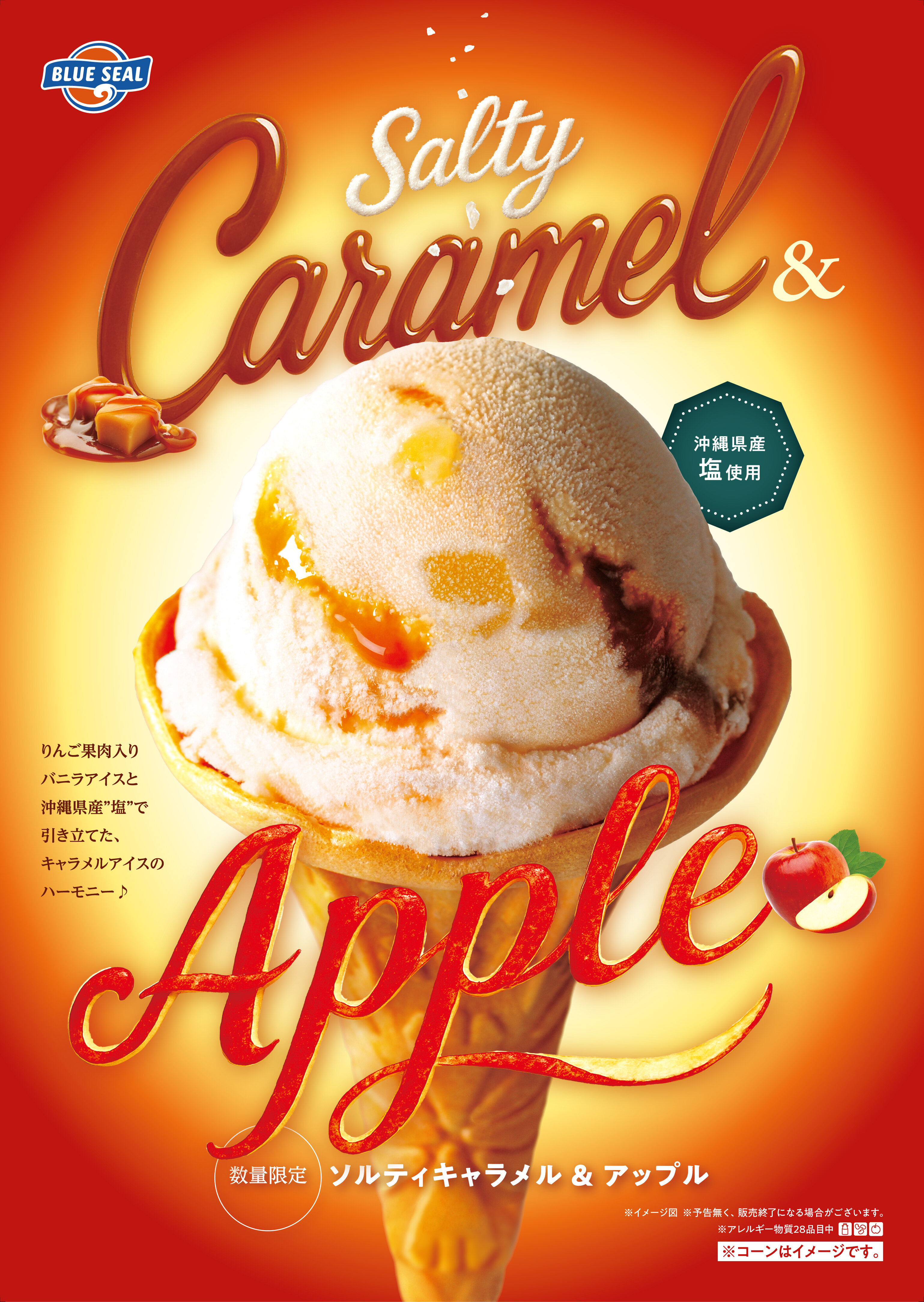 沖縄県産の塩を使用した塩キャラメルアイスと、食感のアクセントにりんご果肉を合わせたバニラアイスの組み合わせが濃厚でとろけるような味わい。